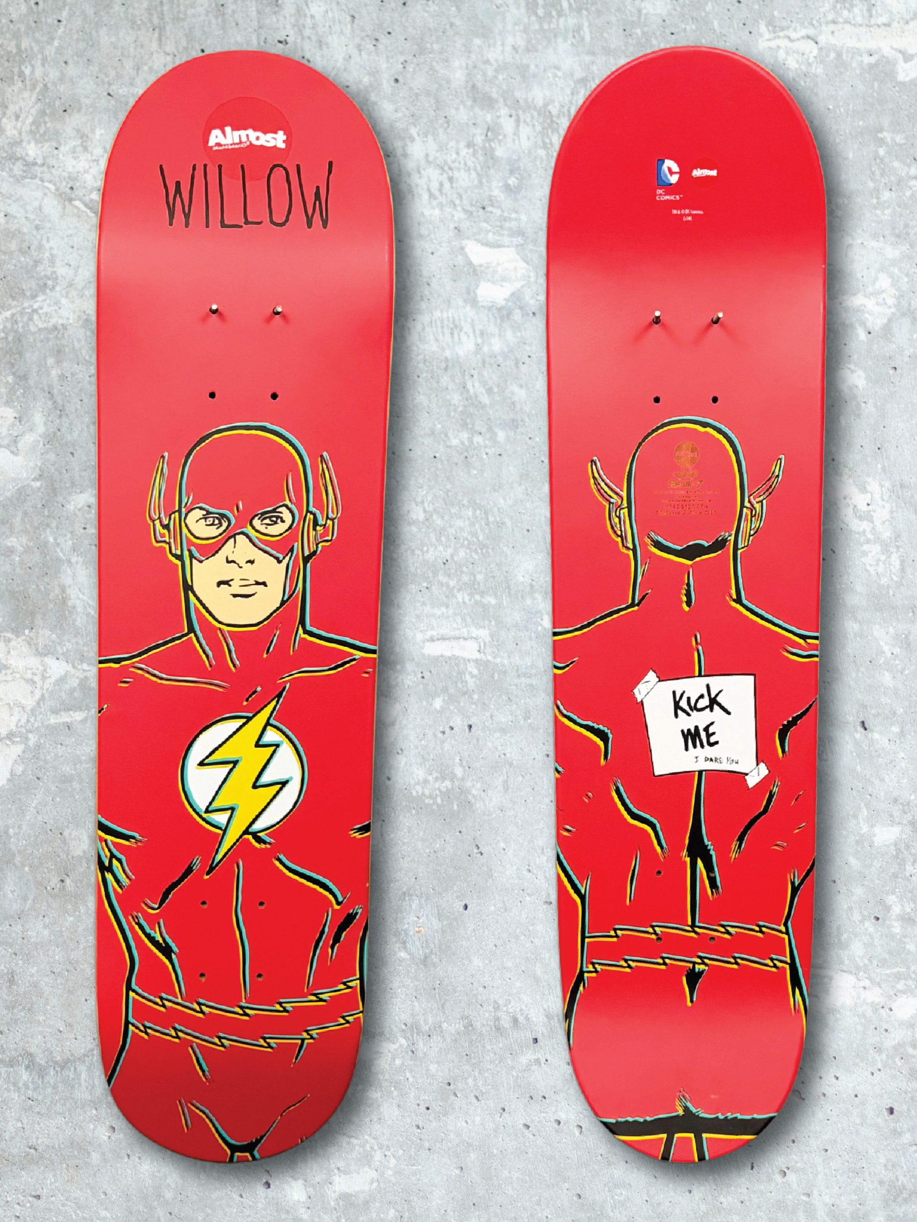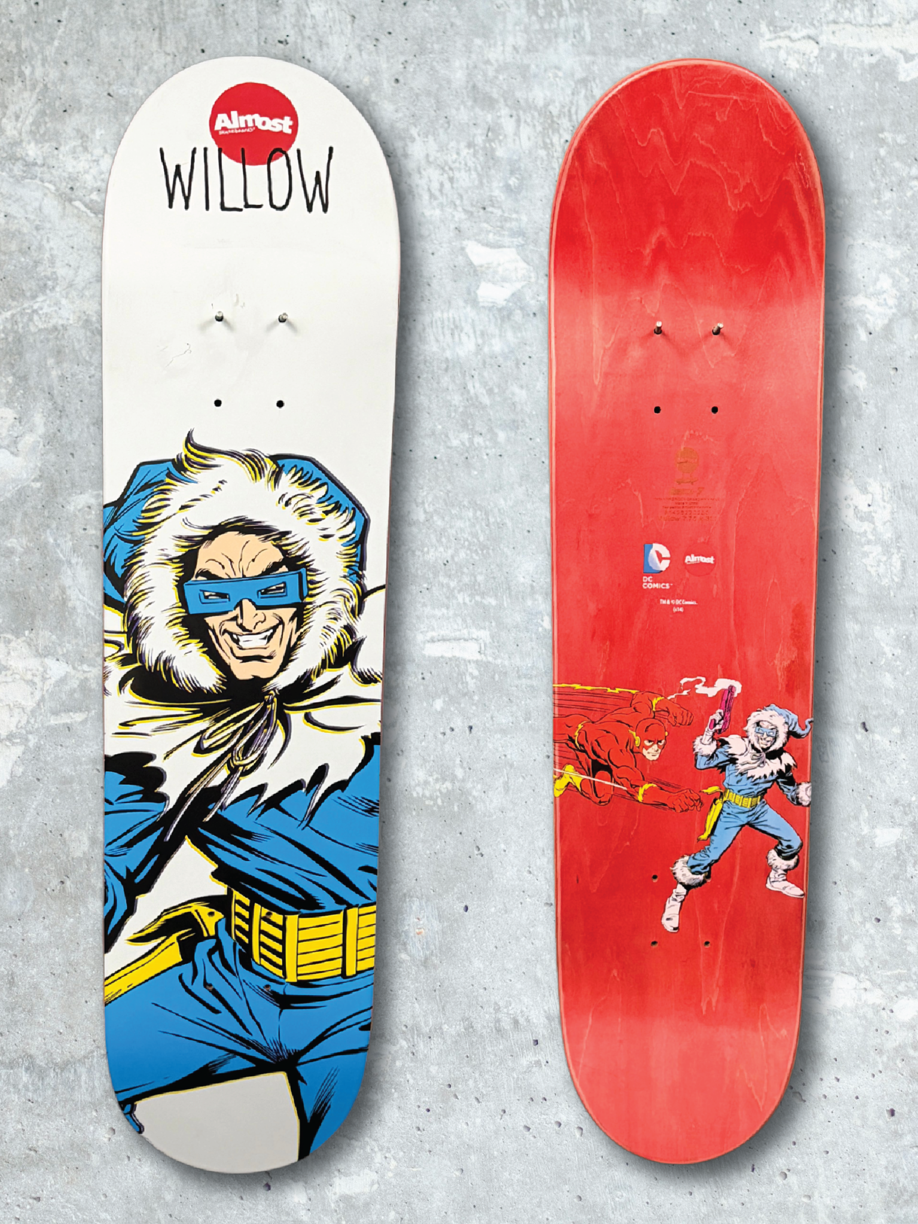 Willow pro model featuring Captain Cold, adding a sharp villain counterpart to the speed and energy represented in the companion hero deck. In the companion Superheroes series, it is paired with The Flash.