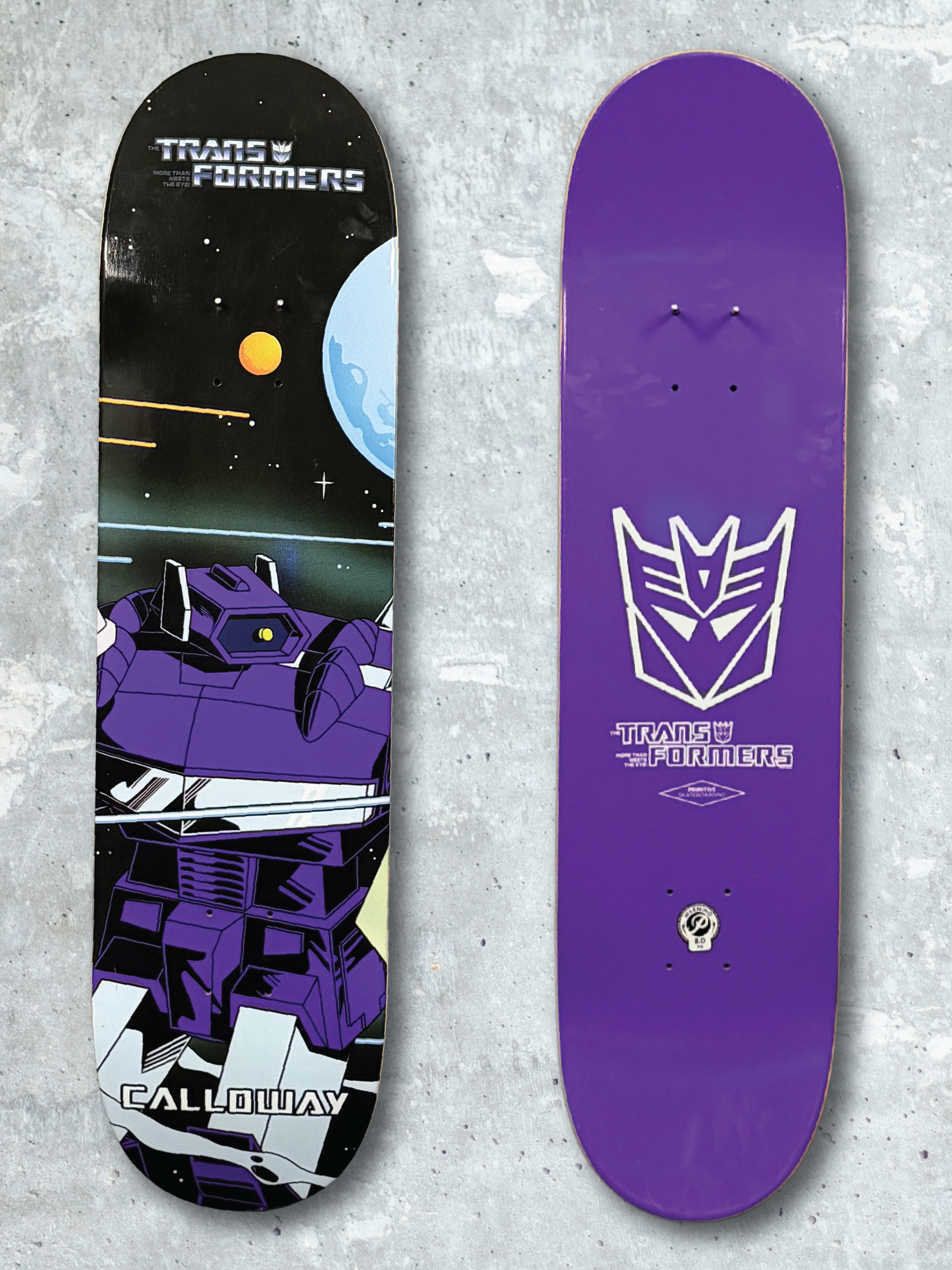 Devine Calloway pro model featuring Shockwave, bringing one of the Transformers universe’s most recognizable Decepticons into the Primitive lineup. Within the series, it adds a darker counterpoint to the Autobot-themed decks.