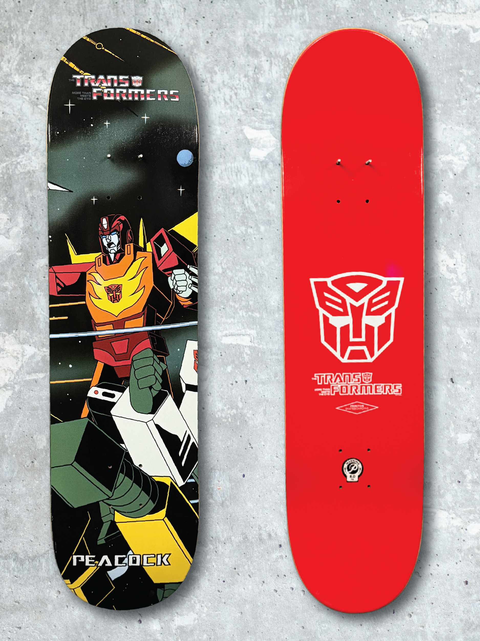 Brian Peacock pro model featuring Hot Rod, adding another recognizable Autobot character to the collection and broadening the series beyond the core rival pairings. Within the lineup, it gives collectors an additional hero-focused deck with strong crossover appeal.