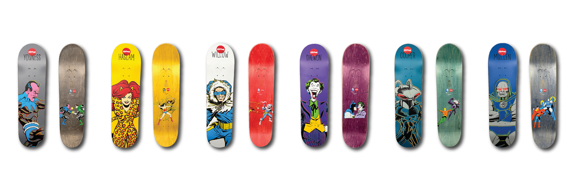 Released in 2014, the Almost x DC Comics Series brought together Almost Skateboards and DC Comics in a collectible collaboration that appealed to both skateboard fans and comic enthusiasts. The release was built around two companion sets: the Superheroes Series and the Supervillains Series, each featuring bold character-driven artwork tied to Almost pro models.